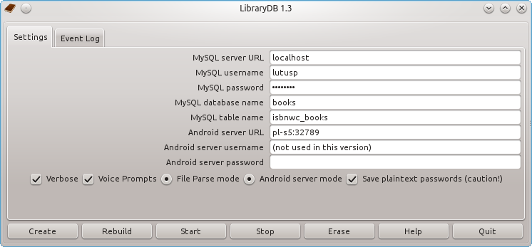 This step describes the Library Database program that converts the scanned ISBN codes into MySQL database records. Setting it up is simpler than installing the Android applications described above. Here's how to proceed on Linux and Windows: