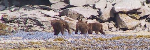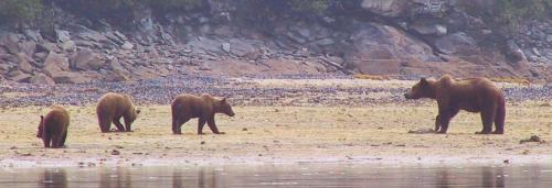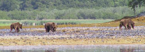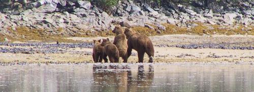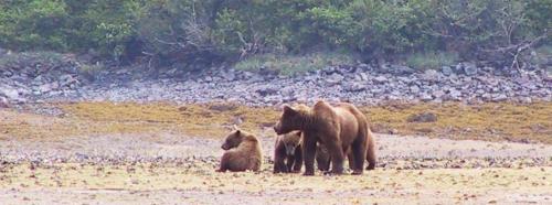 Mama bear and cubs out clamming.
