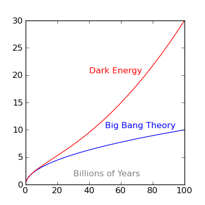 Even though Dark Energy had little role to play in the universe's past, it will play a much larger role in the future. If present thinking about Dark Energy is confirmed, all the matter in the universe will fly apart in a way that contradicts prevailing theory (see Figure 4).